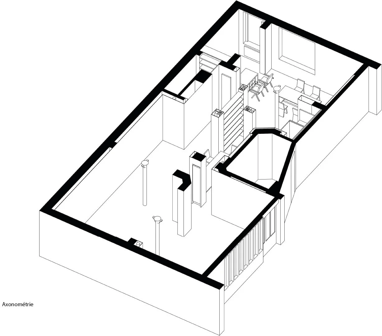 The fragmentation of the space justifies a functional and material approach capable of creating a continuity of space experience. The spaces are brought together by careful attention to the nature of the materials and their resonance. The wooden table, a place of work anchored in the middle of an exhibition space, the glass shelves, the brass table embody the places in which they unfold or anchor.