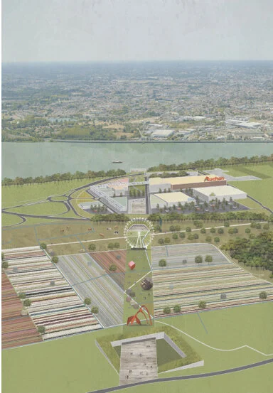 In order to offer a new identity to the site, the project aims to re-define places on the plain with new activities promoting the emergence of real living spaces. These places participate in an urban strategy which aims to reweave the territory while amplifying the pre-existing geographic invariants of the site. The architectural guide proposed helps frame the unknowns of time; presented in the form of a frame, sometimes built, sometimes in a prefigured manner, it can then appear as a gallery, a landscape, a facade or even a crossing. The architectural strategy allows sequencing that is not dependent on the next phase. Each stage or phase has its own characteristics and proposes a mutation of the territory which is not dependent on its previous phase. The entire project aims to build a living center and technology-oriented shopping malls while enhancing actual relationships. By setting up an active diagonal - territorial, relational, commercial anchoring that re-engages all scales - the project wishes to magnify the site's unique potentials by positive contamination.