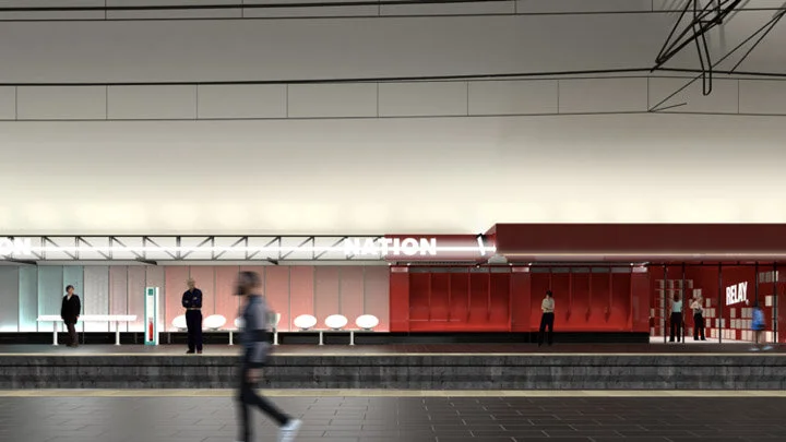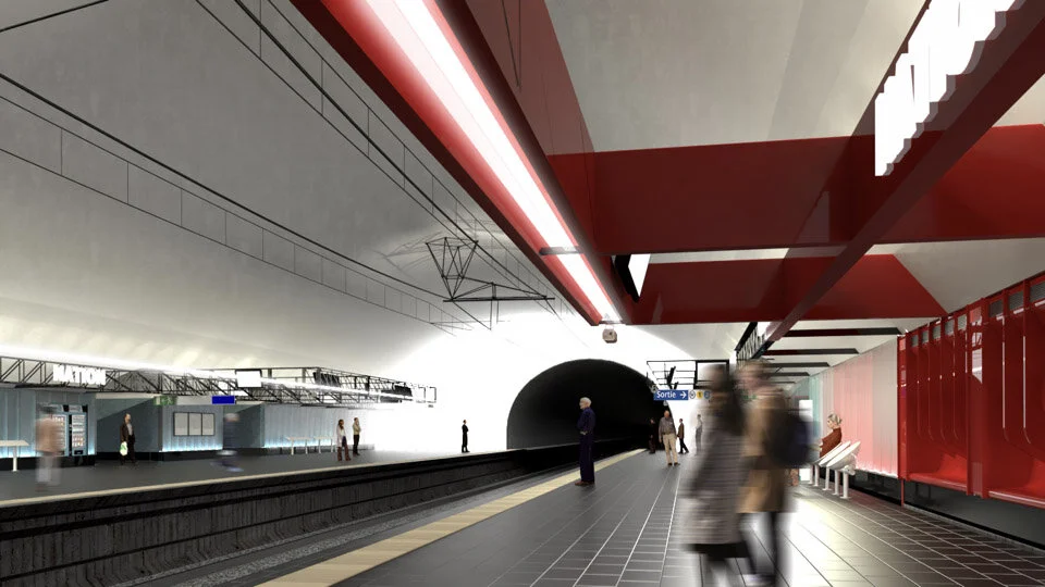 The platform space retains its fluidity and incorporates a new colorimetric signage - connecting the past to the future, the “Nation Red” to the “RATP Blue” - which unfolds along the sidewalks. The signage is supported by the innovative lighting of the station illustrated by the drawing of two light axes along the platform noses, which provide continuous lighting on all tracks.