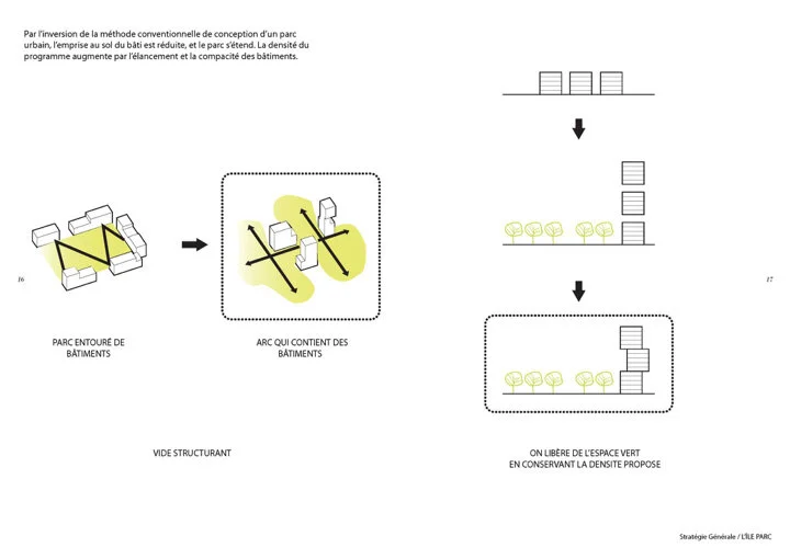 “By reversing the conventional method of designing an urban park, the footprint of the building is reduced, and the park expands. The density of the program increases by the slenderness and compactness of the buildings.”